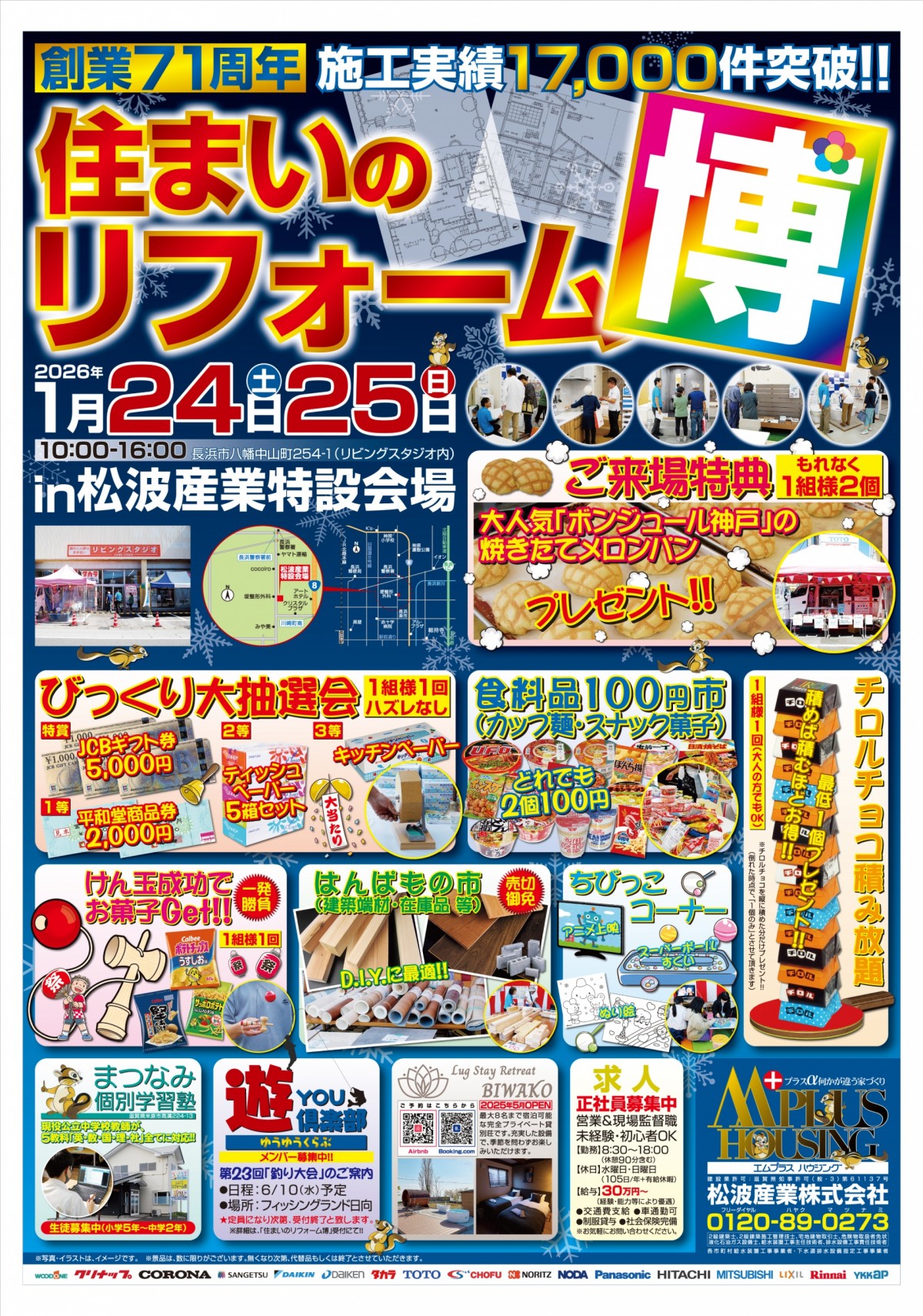 当日は、豪華景品が当たる『びっくり大抽選会』や、大好評『食料品100円市』、豪華景品がそれぞれGetできる『けん玉・チロルチョコ積み』など、盛りだくさんの企画を用意しております。また、来場特典としまして、ボンジュール神戸の『焼きたてメロンパン』をプレゼントします。